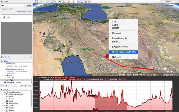 ابتدا مسیر موردنظر برای پروفیل زدن را با ابزار Add Path ترسیم میکنیم سپس روی مسیر راستکلیک کرده و گزینه Show Elevation Profile را انتخاب میکنیم. بهاینترتیب میتوانیم پروفیل طولی مسیر را در یک گراف که در پایین نرمافزار گوگل ارث نمایش داده میشود، ببینیم.