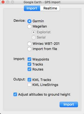 در شاخه Import بعد از انتخاب دستگاه موردنظر (Garmin, Magellan)، موارد موردنیاز جهت واردکردن به گوگل ارث مانند (Waypoints, Tracks, Routes) و فرمت خروجی را تنظیم کرده و درنهایت روی گزینه Import کلیک میکنیم.